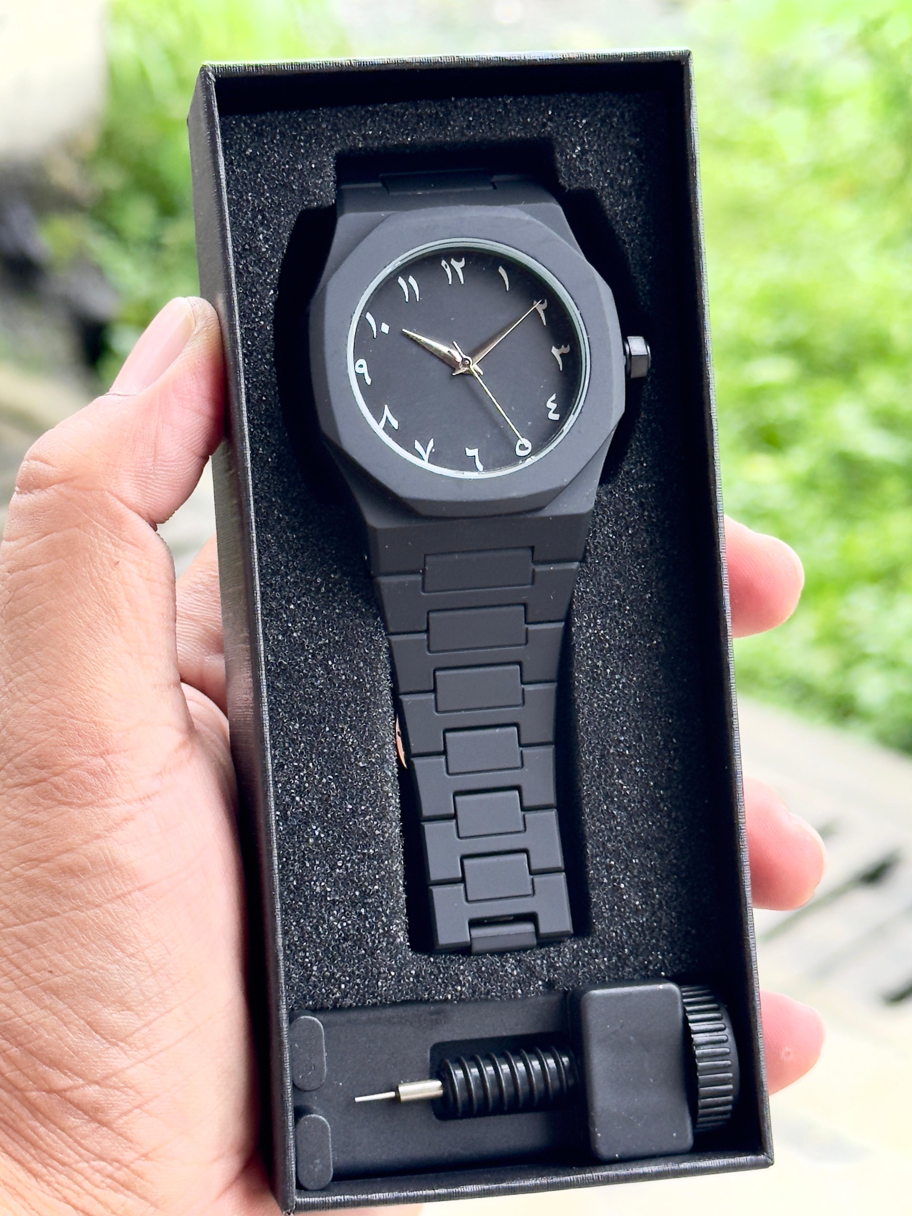 A stunning watch with a bold black design, Arabic numerals, and elegant matching hands that blend tradition with modern style. AURA Features:-👇 * Quartz movement * artistic style dail * Black linked bracelet soft & lightweight * St steel screwed back * St steel bfly lock * water resistance Price:- ₹799/-+ Free Shipping All Over India. All Live Photo’s Packaging – Comes in a foam-fitted box for protection. Tool Included – Extra link-removing tool provided for strap adjustment.