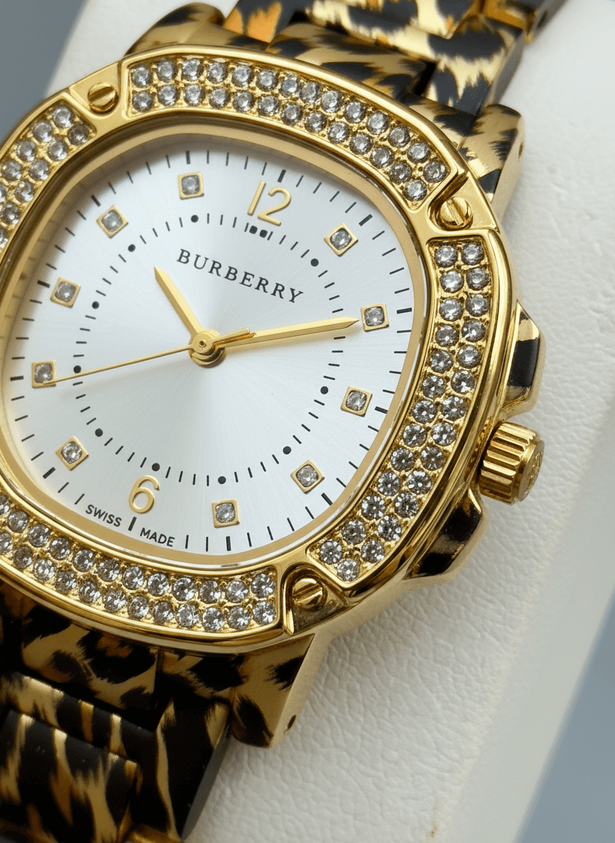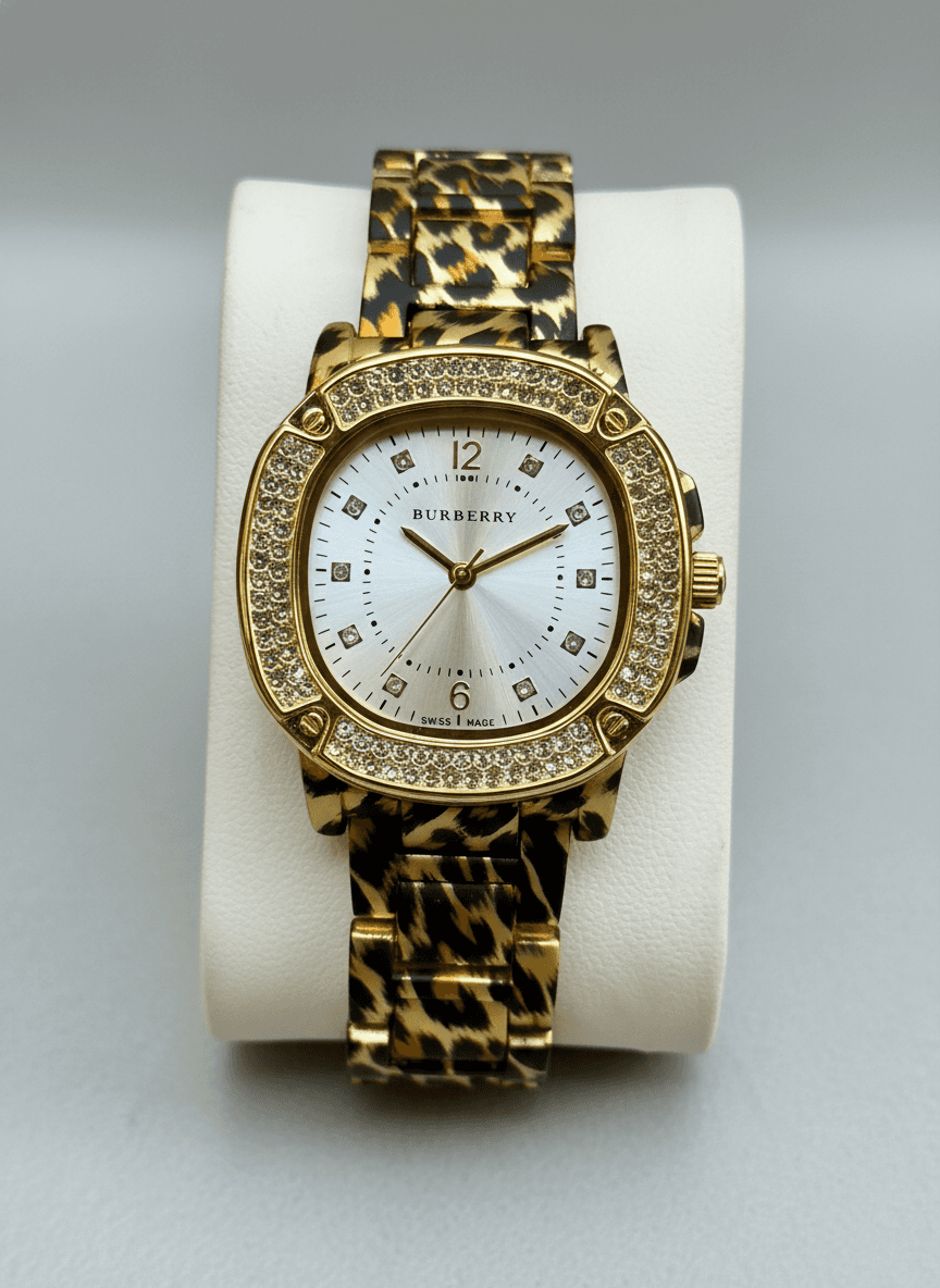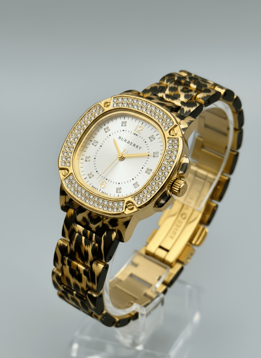 A dazzling blend of luxury and elegance that turns every moment into a statement of style. BURBERRY Glamour Luxury fashion-watch design For her Features:-👇 * Quartz movement * Sunburst dail * Diamond hour markers * Crystal-studded Bezel * Patterned metal bracelet * Ss back & Pressing lock Price:- ₹1299/-+ Free Shipping All Over India. All Live Photo’s