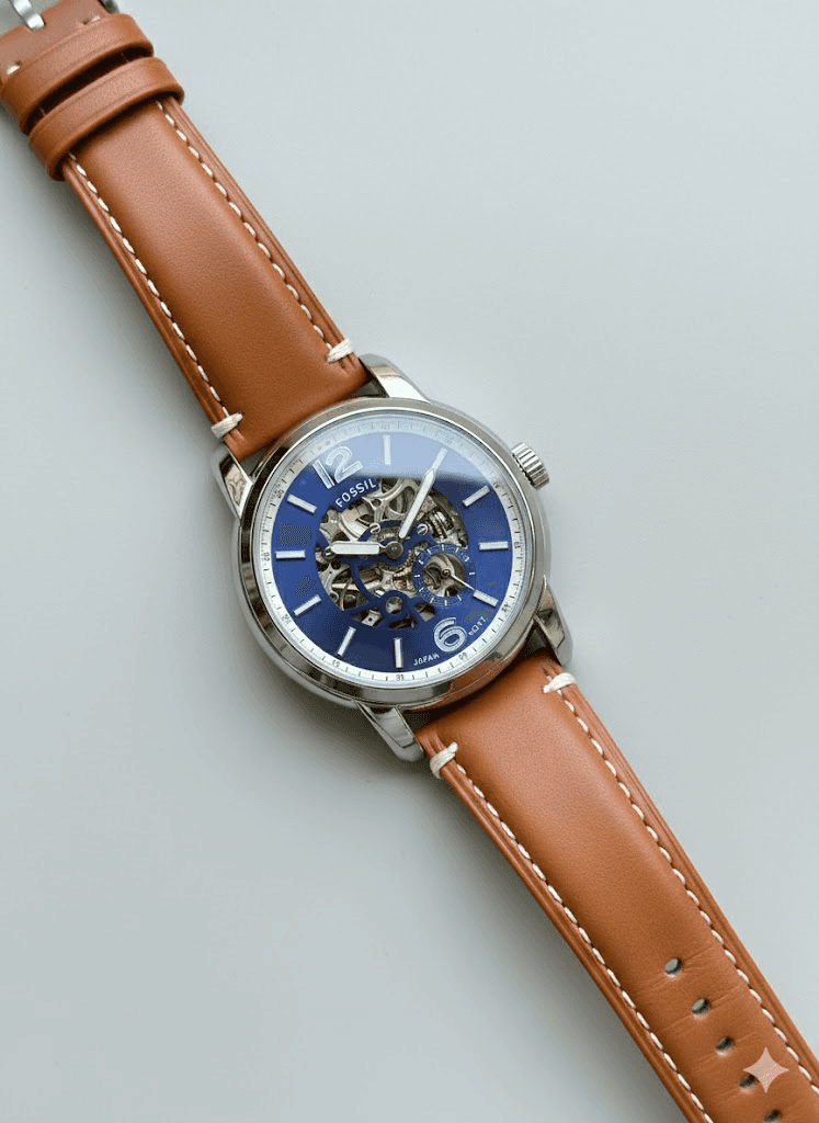 _A stunning blend of classic leather elegance and modern skeleton-dial craftsmanship._ *FOSSIL* Mens *Features:-👇* • Automatic machinery • Small second working • Luminous h&m • Silver metal case • Stitch leather strap • Ss back bezel & Lock *Price:- ₹1999/-*+ _All live photos or videos🤳_