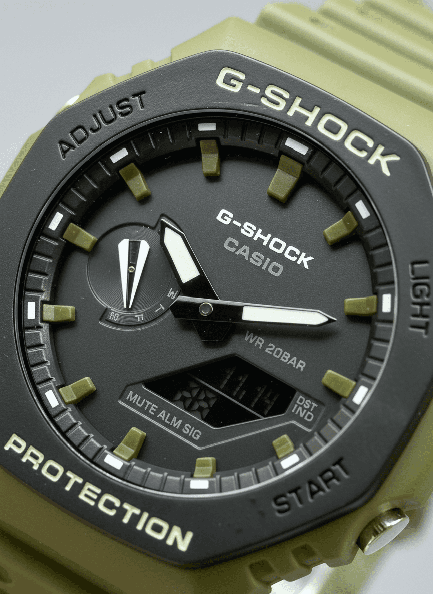 “The olive-green G-Shock looks rugged yet classy, with its bold bezel, clean dial and tough outdoor vibe.” G-Shock Model:- G-1065 Features:-👇 * Analog + digital display * water resistance * LED backlight for night viewing * World time function * Stopwatch * Countdown timer * Daily alarm * Auto calendar * Resin case and strap (lightweight & durable) * Ss Screwed back & Lock Price:- ₹1299/-+ Free Shipping All Over India. All Live Photo’s