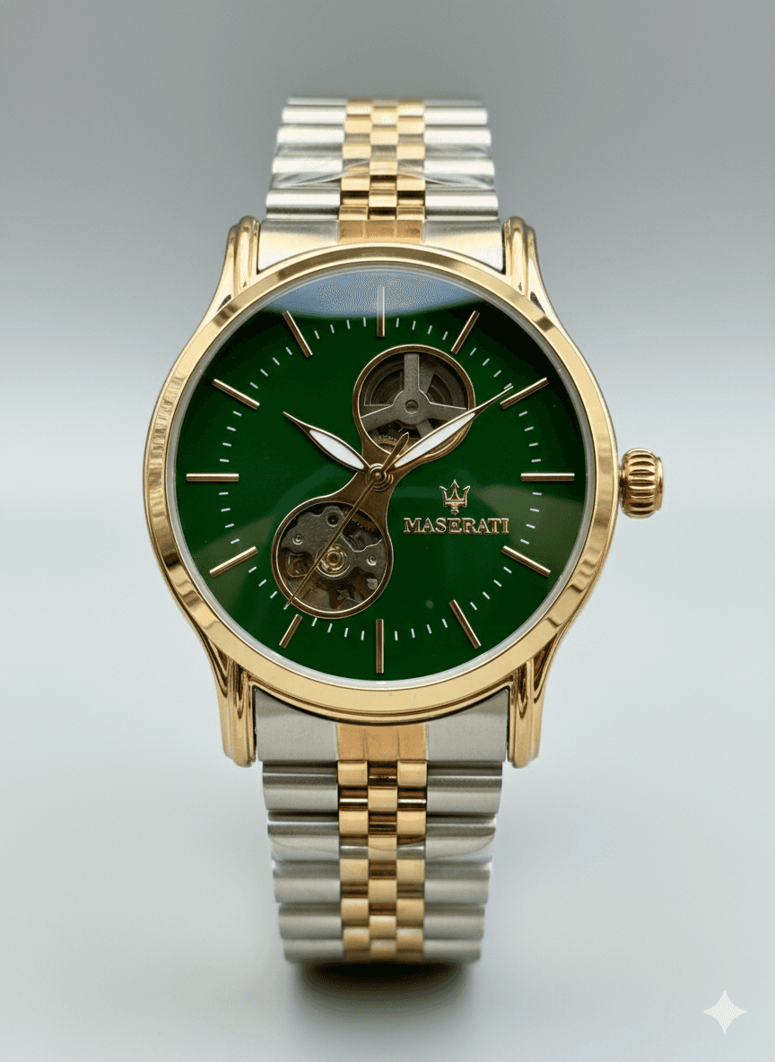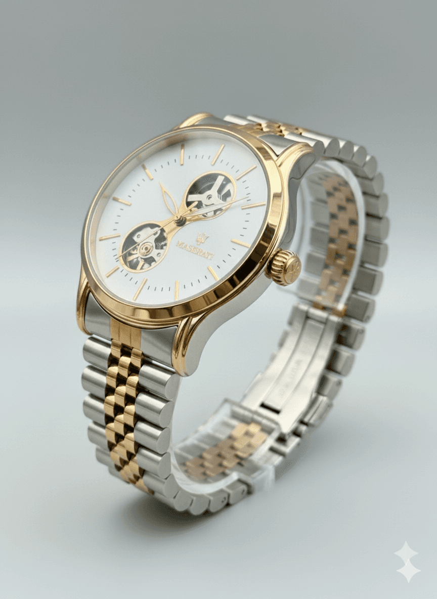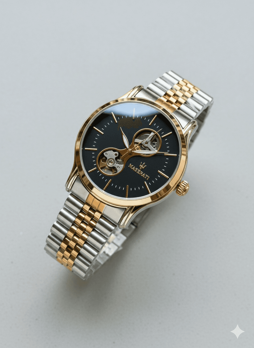 "The elegant open-heart dial paired with the classy two-tone bracelet makes this watch look truly luxurious and refined.” ✨ MASERATI Mens automatic Features:-👇 * Automatic machinery * Luminous hands * Open heart dail * Jubilee bracelet * Ss back bezel & Bfly lock Price:- ₹2199/-+ Free Shipping All live photos Design Style: Luxury, classic, dress watch