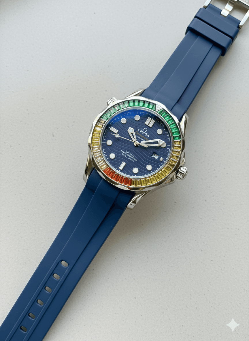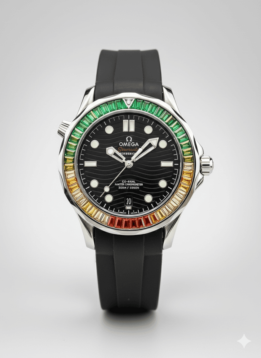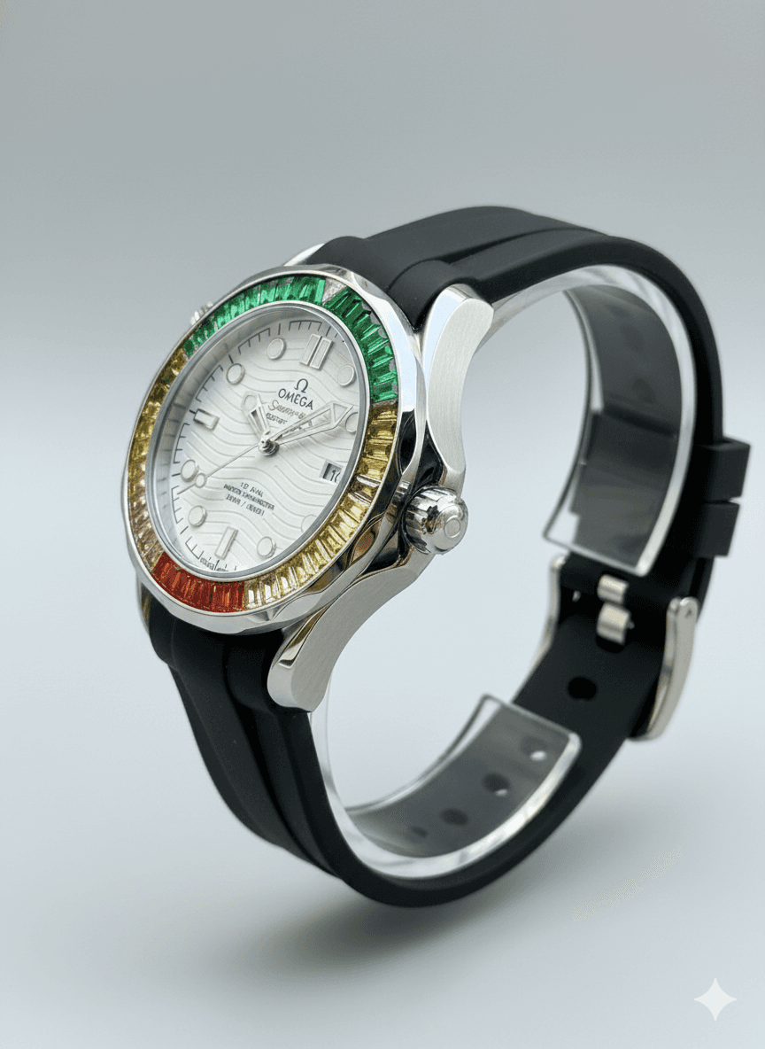 “The rainbow bezel adds a vibrant halo of luxury that instantly turns the watch into a dazzling statement piece.” OMEGA Features:-👇 * Quartz movement * Date window * Wave-textured dial * Luminous h&m * Rubber strap * Multicolor gemstone-style rainbow bezel * Ss back & Lock Price:- ₹1499/-+ Free Shipping All Over India All live photos Overall style: Sporty, premium, and eye-catching luxury look.